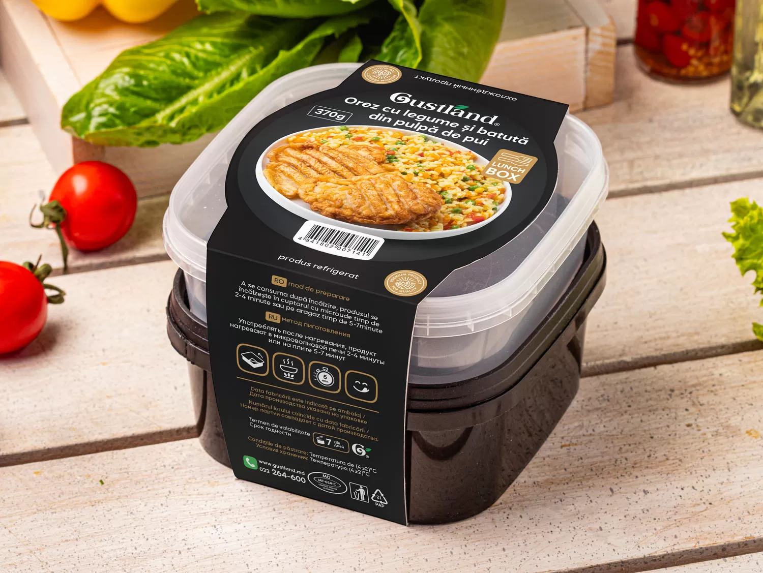a se consuma după încălzire, produsul se încălzeşte în cuptorul cu microunde timp de 2-4 minute (deschideți capacul înainte de încălzire), sau pe aragaz timp 5-7 minute