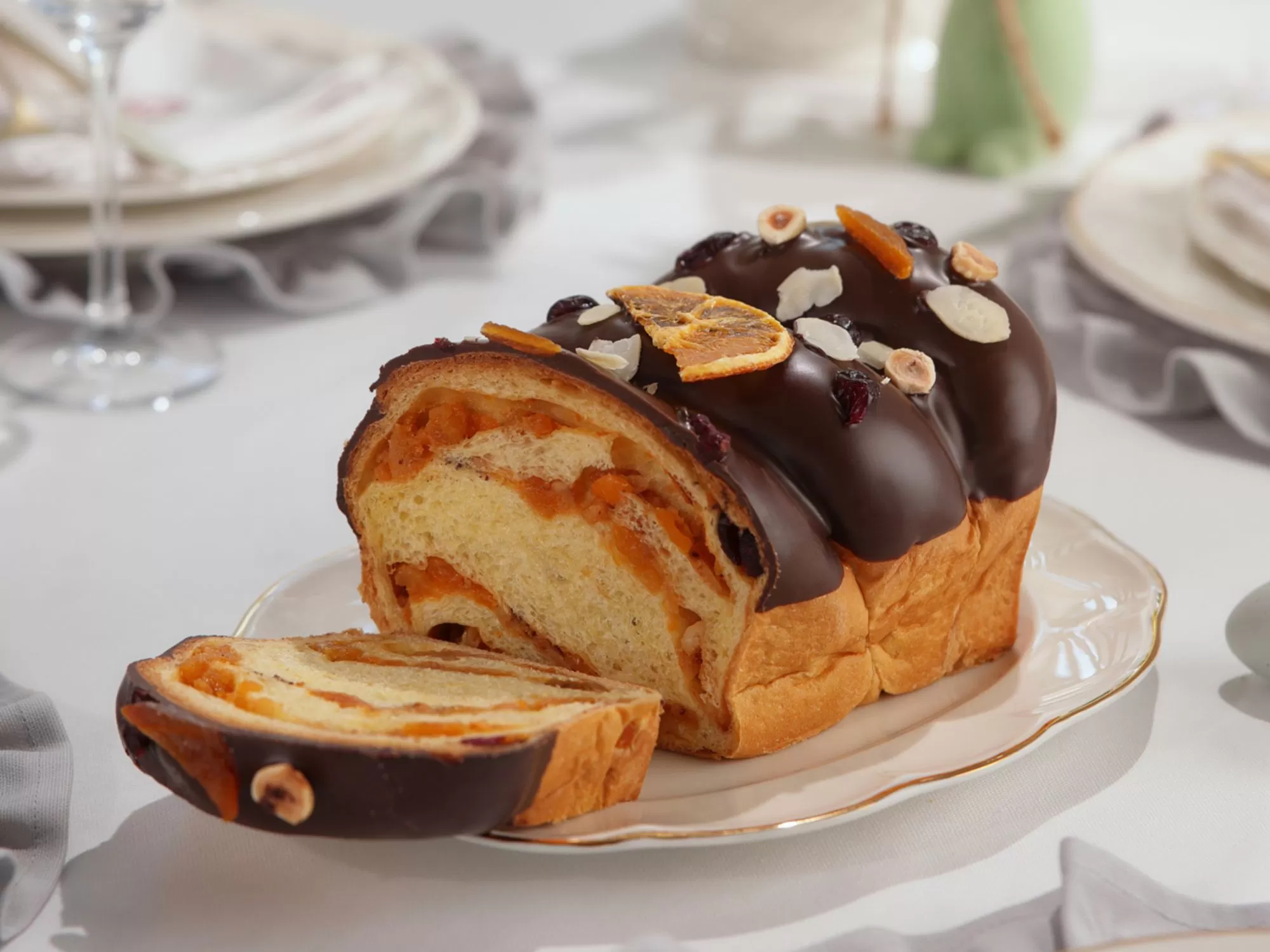 Ruladă din aluat de cozonac cu caise uscate, fructe confiate, alune și migdale